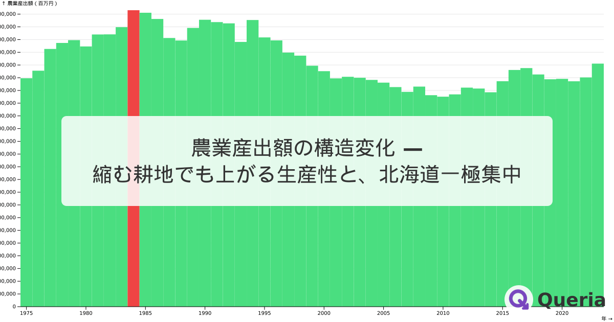 農業産出額の構造変化 — 縮む耕地でも上がる生産性と、北海道一極集中
